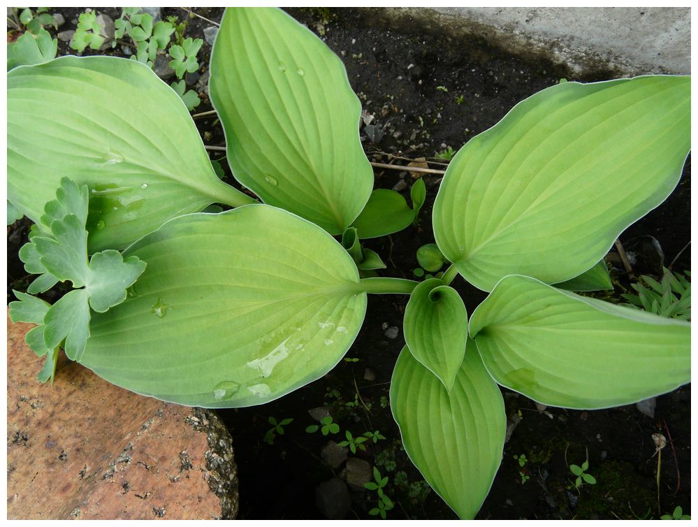 葉を広げたホスタたち