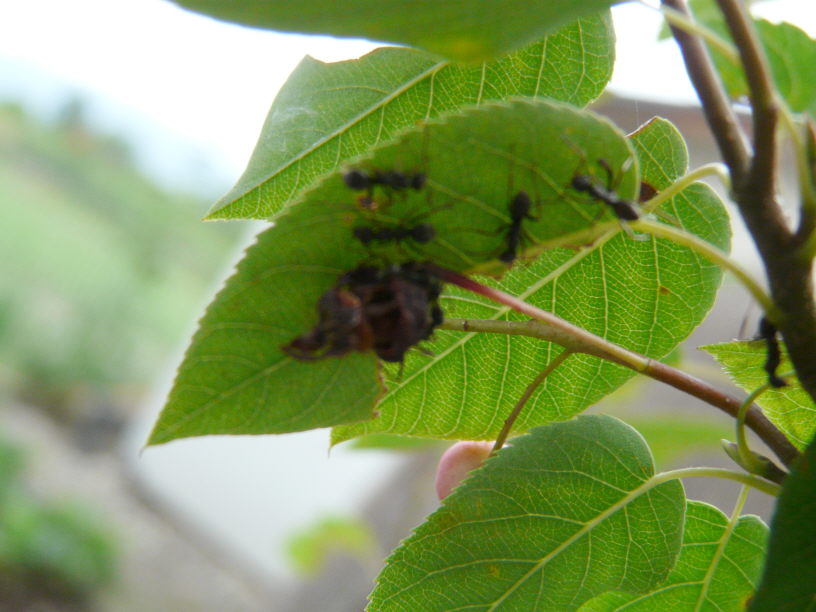 葉っぱの裏に隠れて熟れていた実はアリがむちゃがっついて食べてます。
