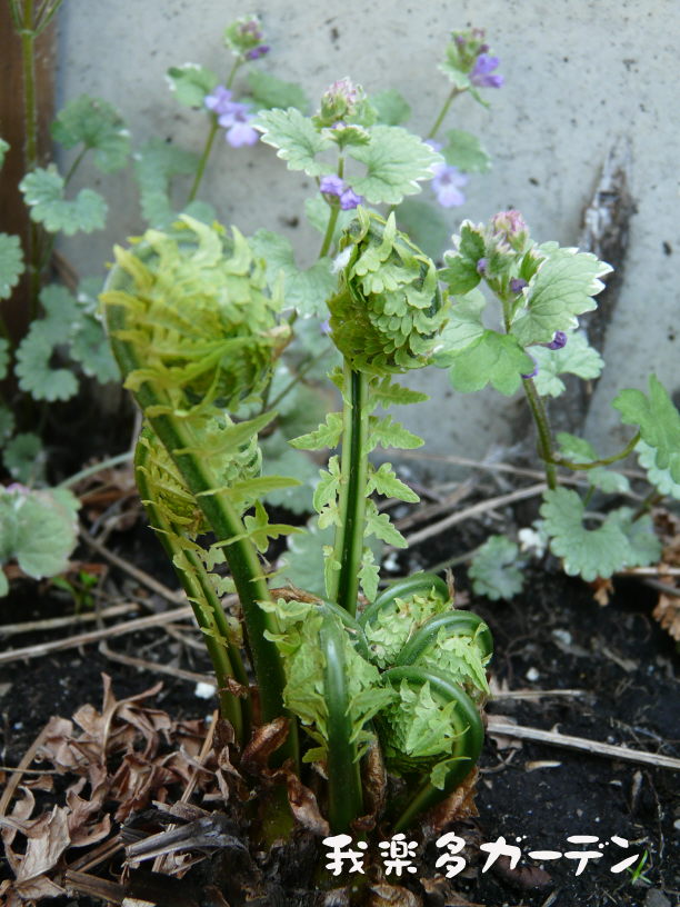 グランドカバー・日陰『クサソテツ(コゴミ)』 おぼけかぼちゃの芽がでたよ